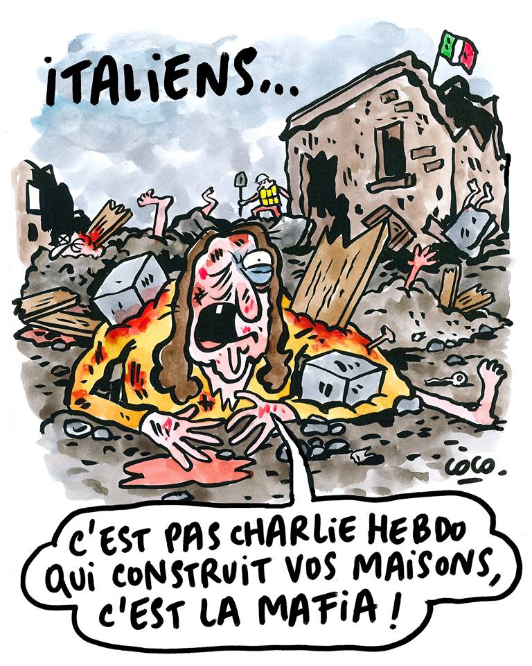 Ho sostenuto che l’arte giornalistica di Charlie Hebdo non sia riconducibile alla satira strincto sensu. Desidero argomentare questa mia personale presa di posizione. L’obiezione che mi si potrebbe avanzare contro è che la satira debba essere cinica, spietata, violenta e “dura” da digerire e sopportare proprio perché solo in questo modo può smuovere le coscienze e promuovere acculturazione e cognizione di causa. Ed è vero, anzi verissimo. La mia difficoltà cognitiva, infatti, risiede proprio in questo passaggio: come è possibile non accorgersi che quella di Charlie Hebdo non sia satira? Si coglie perfettamente il significato ontologico di un concetto (la satira) che poi però viene mistificato volutamente attraverso un riconoscimento deviato e fuorviante del suo stesso contenuto. Queste vignette promuovono una reale comprensione di quanto accaduto? Queste vignette impediscono la proliferazione di alcuni falsi luoghi comuni – del tipo “pizza, mandolino e mafia” -? Queste vignette consentono al lettore di comprendere le reali cause di quanto avvenuto e di spostare l’attenzione sui reali artefici del disastro medesimo – e badate bene che il riferimento alla mafia è presente solo e soltanto nella seconda vignetta, pubblicata a seguito della diatriba mediatica diffusasi per il Web -? Questa è stata davvero la situazione o il contesto o il momento o il modo – e via discorrendo – più congeniale e consono per rappresentare graficamente quanto accaduto? Non sarebbe stato meglio – proprio da un punto di vista vignettistico – attirare l’attenzione “direttamente” sulle istituzioni e/o sul Governo, lasciando in disparte il sangue ed i morti? Oppure – come è ovvio che sia stato – si è optato per tale “soluzione visiva” in risposta ad una comune e semplicistica logica di framing? Siamo davvero certi che da un punto di vista della mera elaborazione mentale, a seguito della visualizzazione di queste due vignette, il pensiero del lettore verta immediatamente sul condannare l’operato delle istituzioni? O, al contrario, resta proprio l’immagine in sé a ricoprire il fulcro principale di tutta la dinamica comunicativa, portando a fare ragionamenti del tipo “i soliti italiani”?